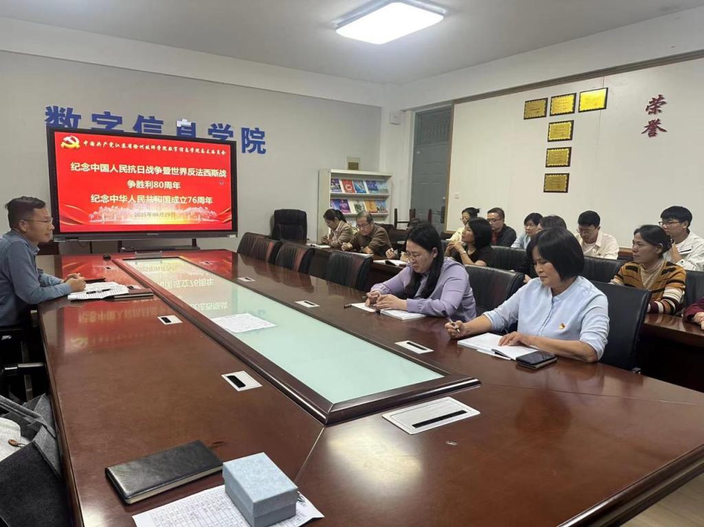 2025年9月29日下午,数字信息学院党总支全体党员在4号教学楼401会议室开展主题党日活动,旨在“纪念中国人民抗日战争暨世界反法西斯战争80周年”“纪念中华人民共和国成立76周年”。